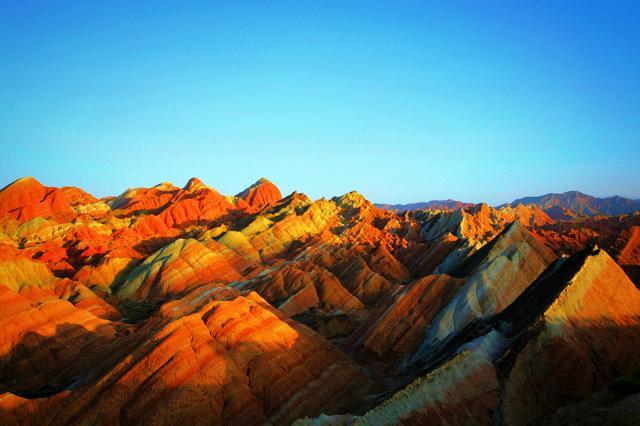 丹霞之美,在于颜色之美、意境之美、变幻之美,七彩斑驳的颜色在蓝天的衬托下愈加变化莫测,引人入胜。